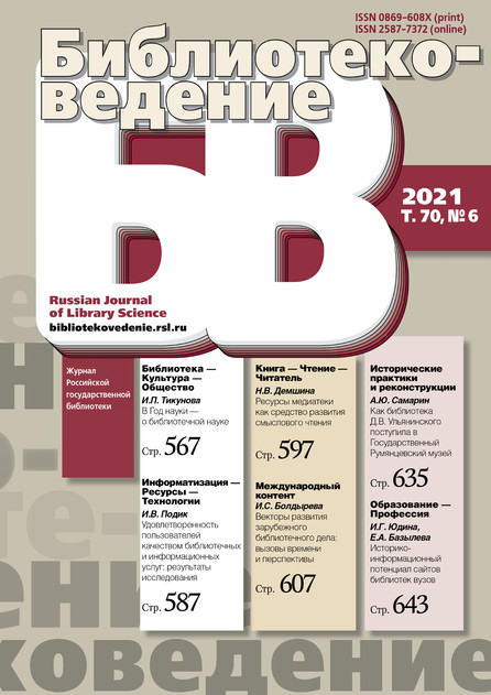 Научно-практический рецензируемый журнал о библиотеке в информационном обществе, технологиях, об уникальных книгах и коллекциях, о чтении, научных исследованиях по истории, теории и современным проблемам библиотечного дела, о библиотеках России и мира, зарубежном опыте. Входит в Перечень ВАК, РИНЦ
