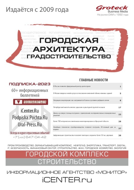 Издается с 2009г. Главным архитекторам муниципалитетов. Мэрам городов. Руководителям и архитекторам проектных организаций. Регулирование: государственное и региональное регулирование; градостроительные планы; назначения и отставки. Архитектурные проекты и решения: жилищное строительство, бизнес-центры, промзоны, объекты социально-культурной сферы, спортивные объекты, объекты культурного наследия, объекты транспортной инфраструктуры. Градостроительство за рубежом. Опыт других стран. Новые технологии в градостроительстве. Индикаторы развития: тенденции, тренды, перспективы, проблемы, конфликты, инциденты. www.icenter.ru