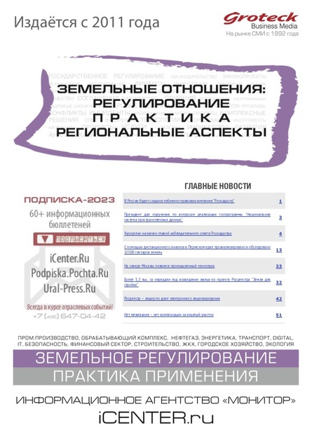 Издается с 2011г. Руководителям и специалистам юридических служб предприятий и организаций, землеустроителям, работникам исполнительных и законодательных органов государственной власти и муниципальных образований, девелоперских и строительных компаний, застройщикам, инвесторам. Государственное и отраслевое регулирование. Профессиональное сообщество: соглашения и партнерства, реорганизации, организационные и кадровые решения. Региональная практика: общее регулирование, земли сельскохозяйственного назначения, земли промышленности и иного спецназначения, земли населенных пунктов: жилищные объекты, земли населенных пунктов: развитие территорий, земли населенных пунктов: индивидуальное строительство, иные земли. Индикаторы развития: проблемы, конфликты, инциденты, арбитражная практика, аналитика, обзоры, экспертные оценки, зарубежные решения и практика. Земельный практикум. www.icenter.ru