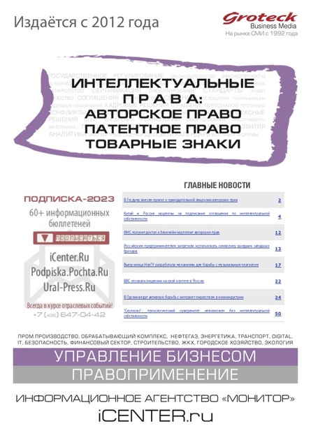 Издается с 2012г. Для специалистов, занятых в сфере инновационной деятельности на внешнем и внутреннем рынках, специалистов в области интеллектуальной собственности и борьбы с контрафактом, практикующим юристам в данной области права, адвокатам, руководителям компаний, авторам разработок, патентным работникам предприятий, бренд-менеджерам. Регулирование. Слияния и поглощения. Сотрудничество. Проекты. Комплексные решения: госструктуры, российские компании и организации, зарубежный опыт и практика. Регистрация прав на интеллектуальную собственность: товарные знаки: бренды, логотипы, торговые марки, патенты: изобретения, исследования, лицензии. Конфликты. Инциденты. Проблемы: российские конфликтные ситуации, зарубежные конфликтные ситуации. Индикаторы развития. Аналитика. Тенденции. Перспективы. www.icenter.ru