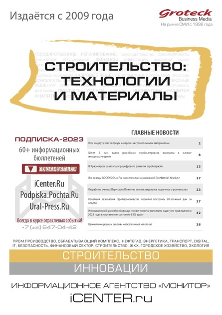 Издается с 2009г. Руководителю и главному инженеру строительной компании. Начальнику ДРСУ. Проектировщику. Маркетологам компаний, занимающихся производством и реализацией строительных материалов. Регулирование: госрегулирование, сертификация, лицензирование, стандарты, региональные программы и решения, HR, кадровые решения и назначения, профессиональное сообщество, соглашения и партнерство. Технологии строительства: проекты и решения. Строительные материалы: производство и реализация строительных материалов, природные, лесные, керамические материалы и изделия, бетоны и растворы, металлы, вяжущие вещества, теплоизоляционные материалы, стекло, полимерные стройматериалы, лаки и краски. Индикаторы развития: проблемы, конфликты, инциденты, Россия: аналитика, обзоры, тренды, зарубежные опыт и практика. Практические рекомендации специалистов. www.icenter.ru