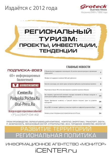 Издается с 2012г. Для региональных туристических агентств и туроператоров, имеющих региональные отделения; министерств туризма краев и областей; владельцев транспортных и экскурсионных компаний; директоров областных музеев, менеджеров по рекламе и продвижению мини-отелей и отелей. Регулирование. Меры, применяемые региональными органами власти по повышению интереса к регионам; улучшению сервиса, разработке новых туристических маршрутов, строительству гостиничных комплексов. Шаги по поддержке малого бизнеса в туризме, проведению пресс-туров. Практические решения: российские и зарубежные новые проекты. Этнографический, агротуризм. Экологические маршруты. Коммуникации: транспортные, информационные. Индикаторы развития: аналитика, обзоры, статистика. Тенденции и перспективы. Экспертные мнения. www.icenter.ru