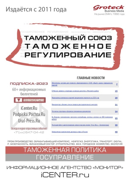 Издается с 2011г. Для руководителей организаций, работающих в сфере внешнеэкономической деятельности, таможенных брокеров и владельцев складов временного хранения, международных юристов и транспортников. Регулирование. Организация деятельности: соглашения и партнерство, реорганизация, работа с обращениями граждан и бизнеса, HR, кадровые решения, персоны, борьба с коррупцией, конфликты. Практические аспекты деятельности: таможенный контроль, таможенное декларирование, таможенные платежи, автоматизация, техническое оснащение, опыт таможенных подразделений. Таможня информирует... Индикаторы развития: аналитика, обзоры, экспертные оценки, итоги деятельности таможенных органов. www.icenter.ru