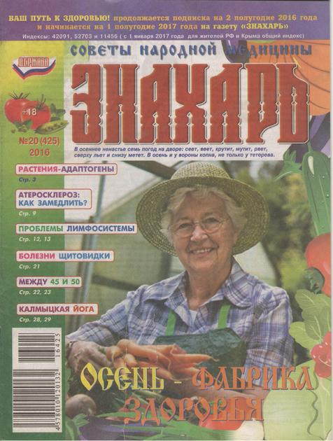 Лучшие народные рецепты оздоровления организма. Постоянные рубрики газеты: "Ларец мудрости", "Травяные прописи" и "Вершки и корешки" (о лекарственных травах), "Лекарство от старости", "Лаборатория Знахаря", "Щит здоровья", "Из личного архива" (лучшие рецепты) и ещё много всего интересного и полезного для здоровья души и тела.