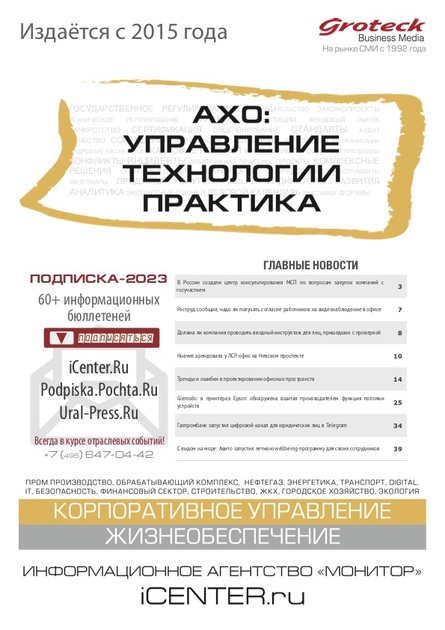 Издается с 2015г. Для административных директоров, директоров по общим вопросам, заместителей руководителей предприятий по АХД, начальников АХО и АХЧ, офис-менеджеров, администраторов различных служб, а также для всех заинтересованных лиц. Регулирование. Регламентирование: госзакупки, взаимоотношения с контрагентами, трудовые вопросы. Эксплуатация и обслуживание зданий и помещений: арендные отношения, офисные помещения, инженерные системы, обустройство офисного пространства, обслуживание помещений. Организация материально-технического обеспечения: компьютерная и оргтехника. IT, канцелярские товары и офисные принадлежности, гаджеты, курьерская служба, транспорт. Обеспечение социального пакета. Представительская и командировочная деятельность. Организация и обеспечение деятельности АХО. Практический опыт компаний. Индикаторы развития: аналитика, тенденции. www.icenter.ru