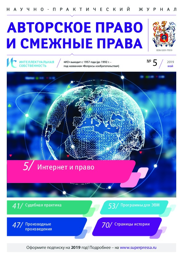 Научно-практический журнал. Включен в РИНЦ. Первый российский специализированный журнал по данной тематике. Выходит с 2000 г. Незаменимый помощник для авторов, правообладателей, юристов. Компетентно о том, как защитить результаты творчества и не допустить нарушения ваших прав. Статьи ведущих специалистов: Судебная, арбитражная, правоприменительная практика. Типовые формы договоров. Интервью, блиц-опросы, мнения экспертов. Законы, документы в области ИС и комментарии к ним.
