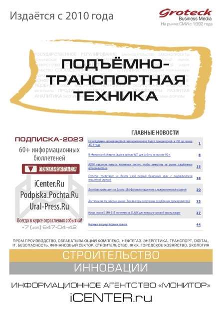 Издается с 2010г. Руководителям и специалистам коммерческих и государственных предприятий, эксплуатирующих подъёмно-транспортное оборудование. Специалистам предприятий, занимающихся исследованиями, разработкой, производством, эксплуатацией и ремонтом подъёмно-транспортной техники и средств механизации погрузочно-разгрузочных и складских работ. Законодательные акты и инициативы. Нормативная база. Сертификация. Производство и сервис: государственно-частное партнерство; новые производства; сервисные центры. Маркетинг и продажи: демонстрационные показы; обзоры техники; поставки техники; лизинг и аренда. Новинки: высотные и специальные краны; автомобильные и гусеничные краны; грузоподъемные машины; погрузочно-разгрузочные машины; машины напольного транспорта; транспортирующие машины и устройства; спецтехника, навесное оборудование. Интеллектуальные системы, ПО.    Индикаторы развития: аналитика, обзоры, статистика. Тенденции и перспективы. Экспертные мнения. www.icenter.ru