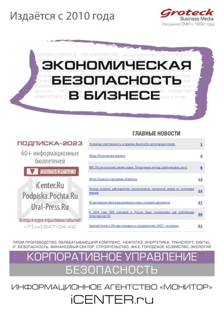 Издается с 2010г. Руководителю предприятия. Финансовому директору. Security-директору. Руководителю службы экономической безопасности. Государственное регулирование: законопроекты и инициативы, принятые решения, региональное и муниципальное регулирование. Государственно-частное партнерство. Профессиональное сообщество. Банковская система. Банки и бизнес. Комплексные решения компаний: административная и финансово-хозяйственная деятельность, IT-инструменты, автоматизация, управление персоналом. Разъяснения. Рекомендации: государственных органов, экспертов и специалистов. Индикаторы развития: проверки, аудит, судебная практика, экономические угрозы, конфликты и инциденты, тенденции и перспективы: аналитика, обзоры, экспертные мнения. www.icenter.ru