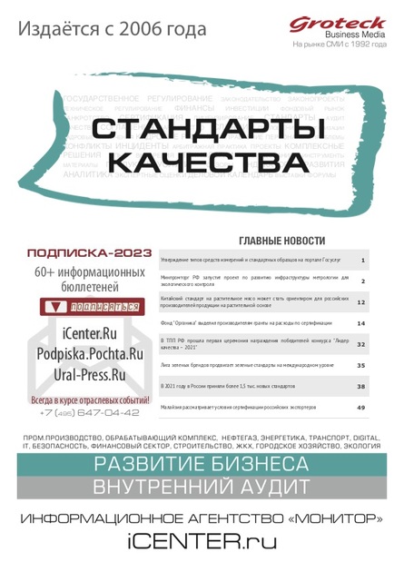 Издается с 2006г. Руководителям организации. Директорам по качеству. Руководителям и специалистам служб менеджмента качества, стандартизации, нормоконтроля. Специалистам, ответственным за планирование и проведение внутренних аудитов системы менеджмента качества (СМК). Специалистам, участвующим во внутренних проверках СМК. Маркетологам. Регулирование: законодательные акты и инициативы, отраслевое регулирование, региональные решения. Соглашения и партнерства. Профессиональные сообщества. Сертификация: решения и практика: сертификация продукции, сертификация работ и услуг, сертификация систем менеджмента, производства, сертификация персонала. Индикаторы развития: проблемы, конфликты, инциденты, зарубежные решения и практика, рейтинги, бренды, премии, аналитика, обзоры, экспертные оценки. Практикум специалиста по качеству. www.icenter.ru