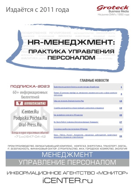 Издается с 2010г. Топ-менеджерам государственных и коммерческих организаций. Руководителям и специалистам кадровых служб, отделов обучения и развития персонала. Директорам и менеджерам служб управления персоналом. Сотрудникам кадровых агентств и консалтинговых компаний. Внутренним аудиторам, тренерам и психологам компаний. Государственное регулирование. Партнерство. Соглашения. Комплексные решения: опыт компаний; сертификация. Лицензирование. Стандарты. Практические аспекты: технологии управления персоналом, информационное обеспечение, практика решения трудовых вопросов, организация работы HR-службы. Индикаторы развития: тенденции, аналитика, обзоры, экспертные мнения. Проблемы. Конфликты. Инциденты. ТОП Мероприятия. Информационный бюллетень. www.icenter.ru